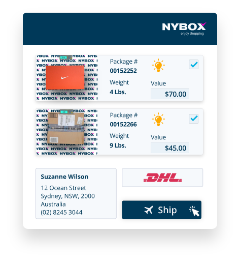 Una volta ricevuti gli articoli nel tuo account NYBox, puoi Consolidare, Reimballare e/o Spedire i tuoi pacchi nel suo paese.